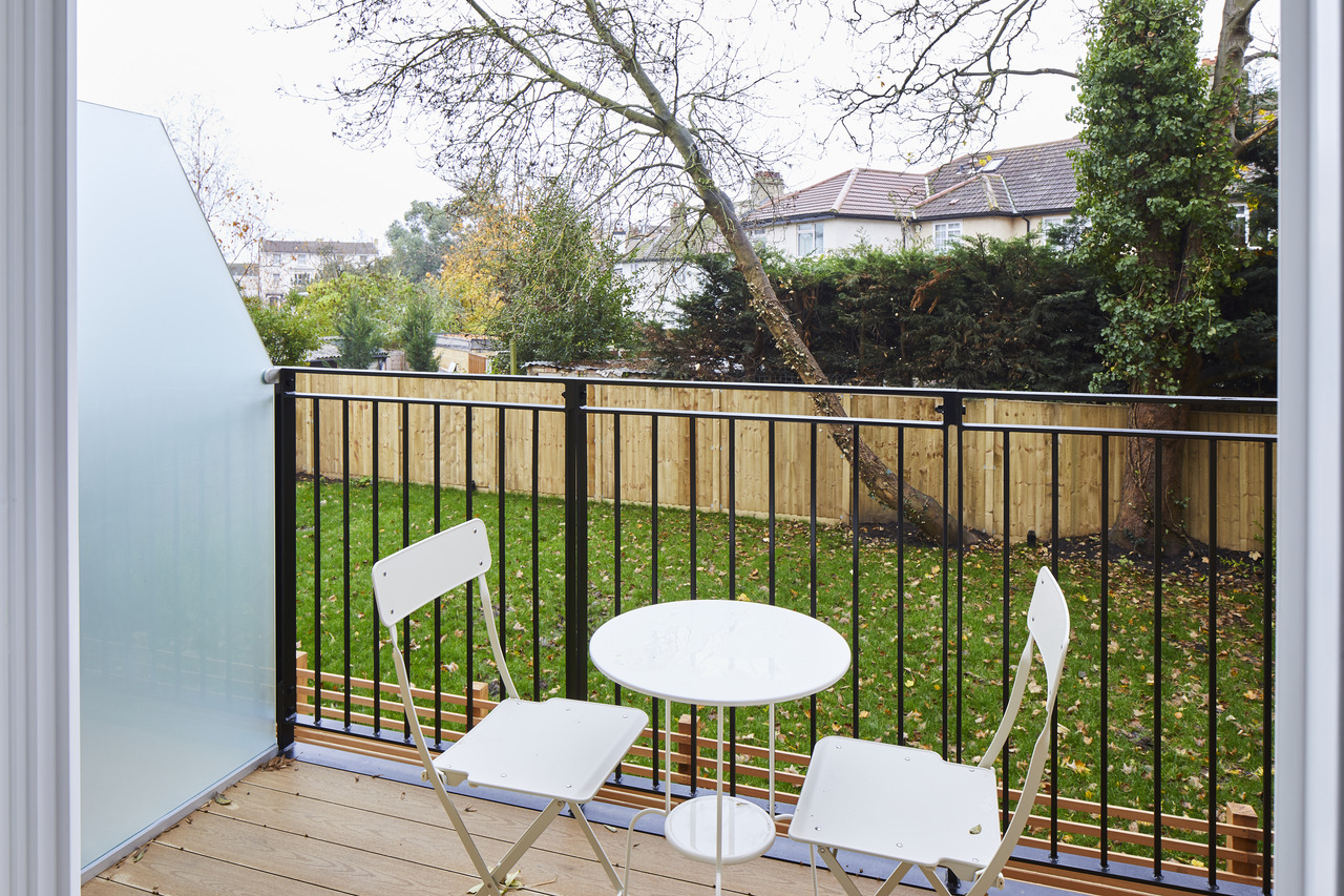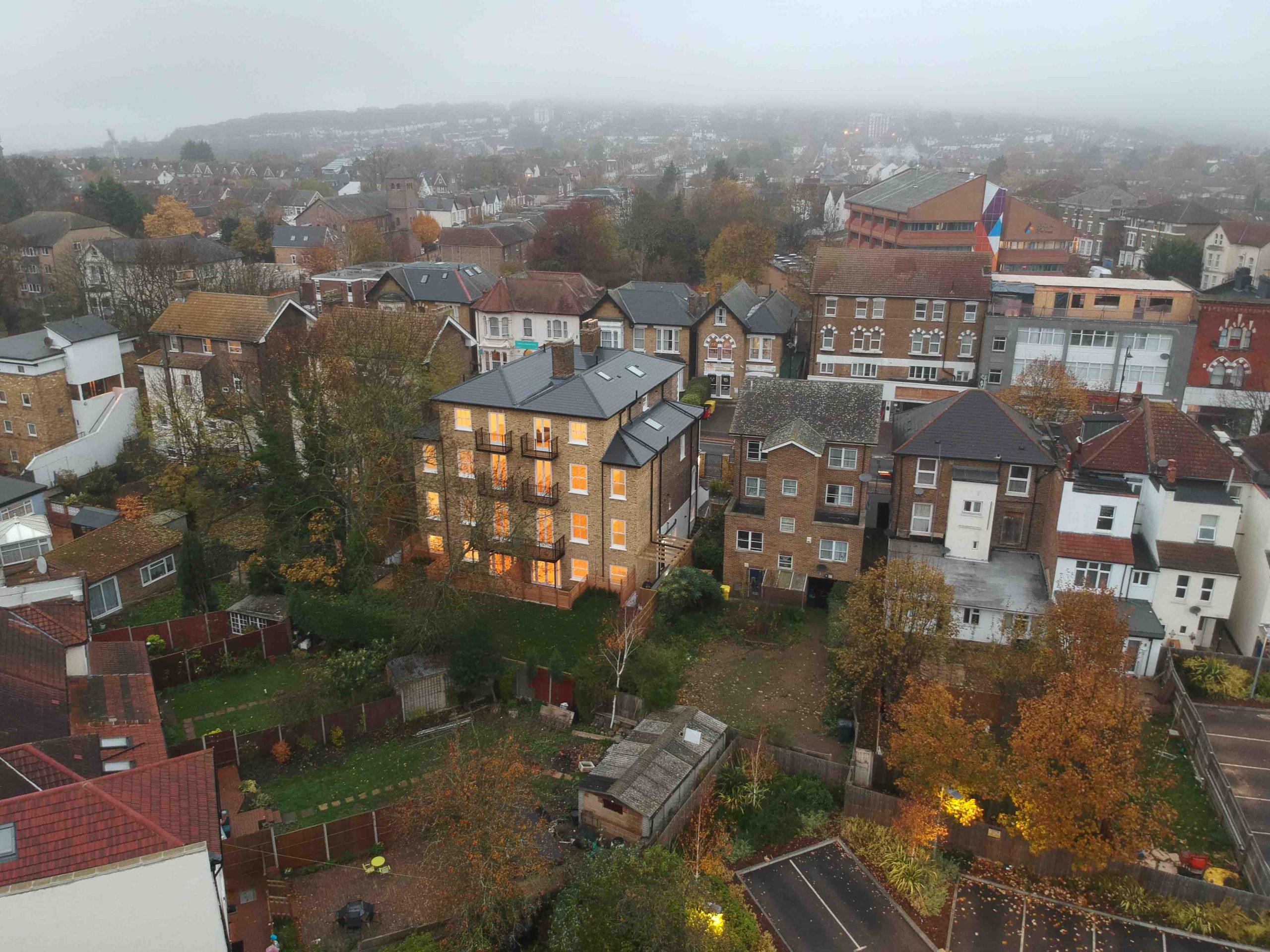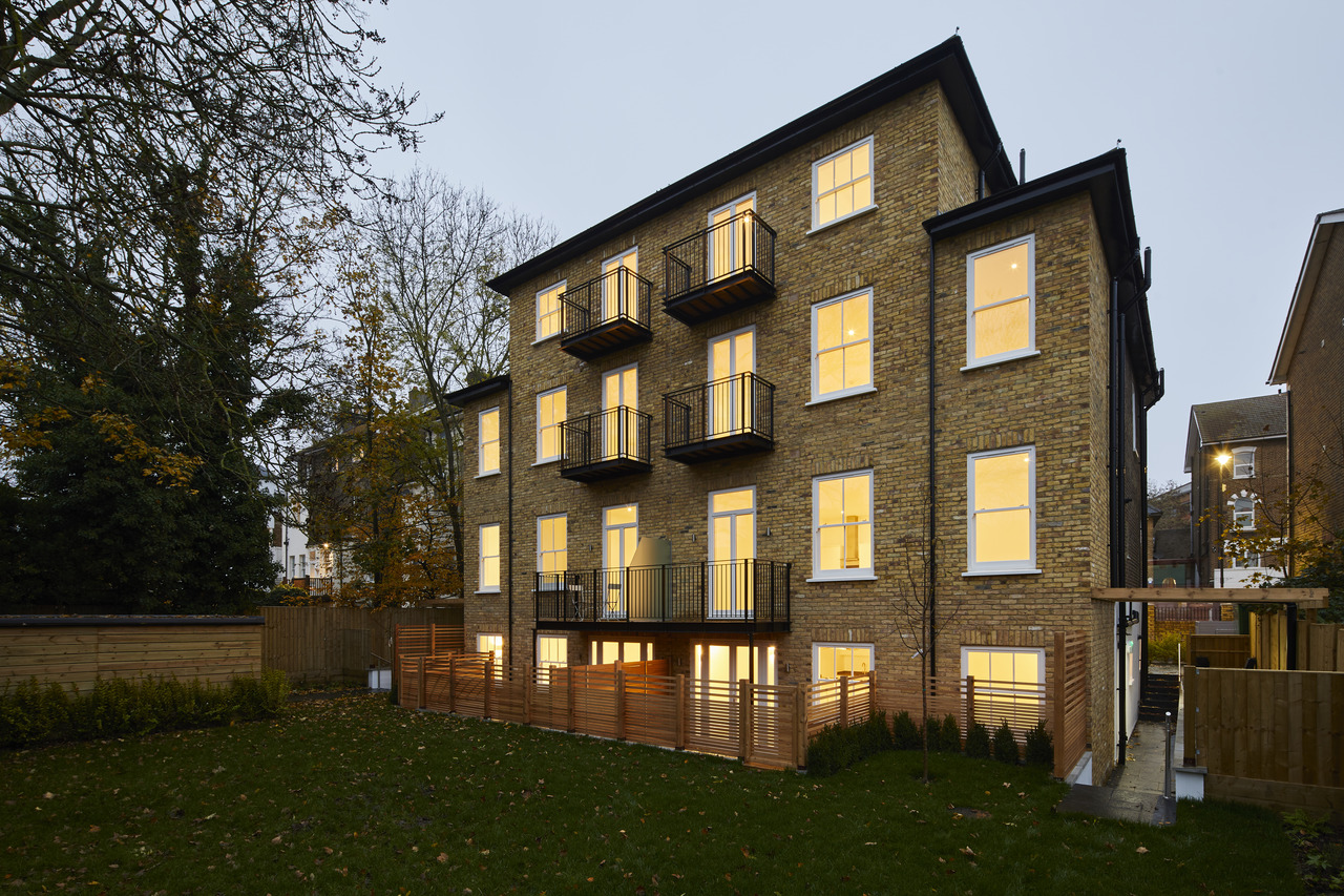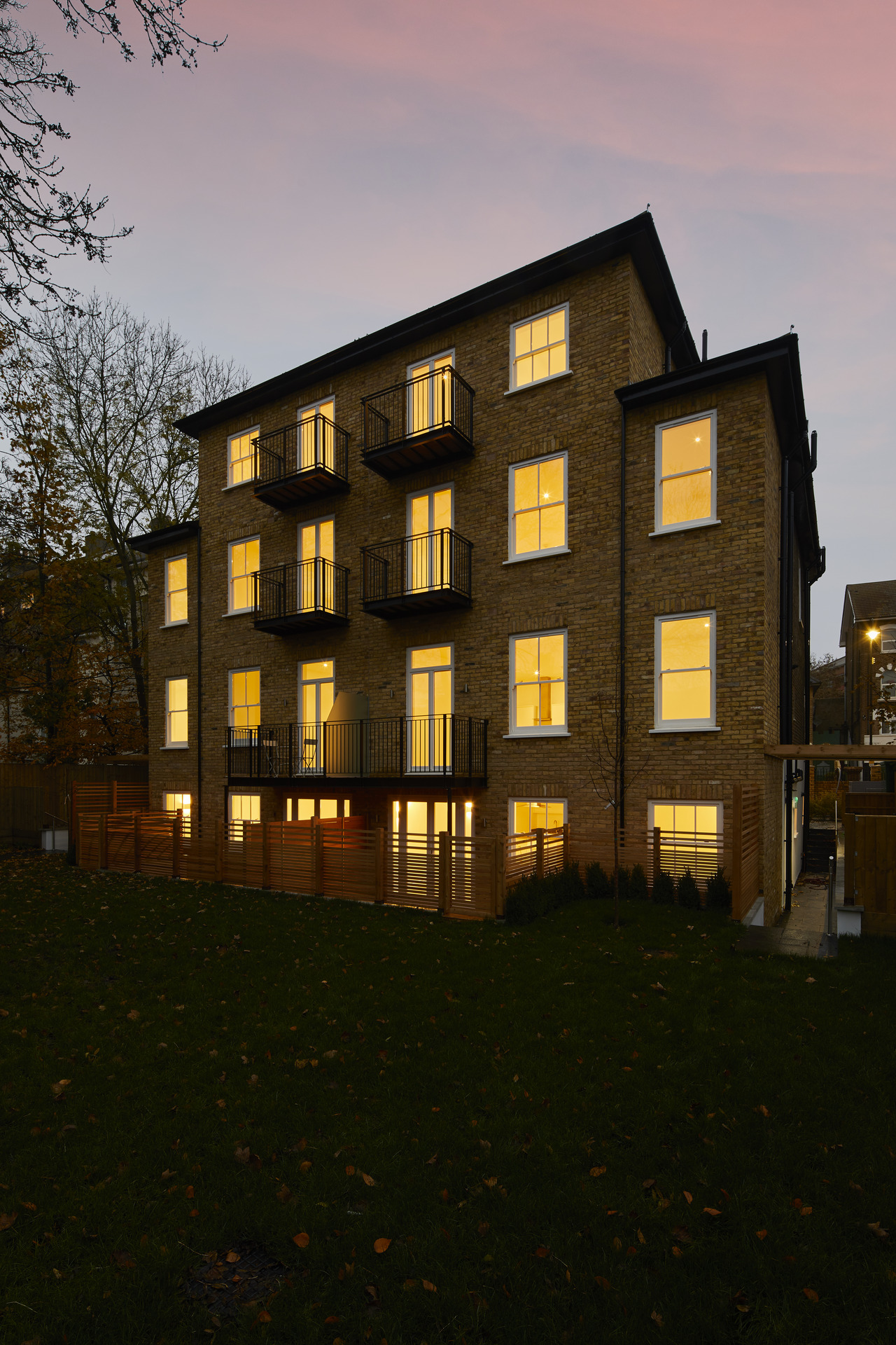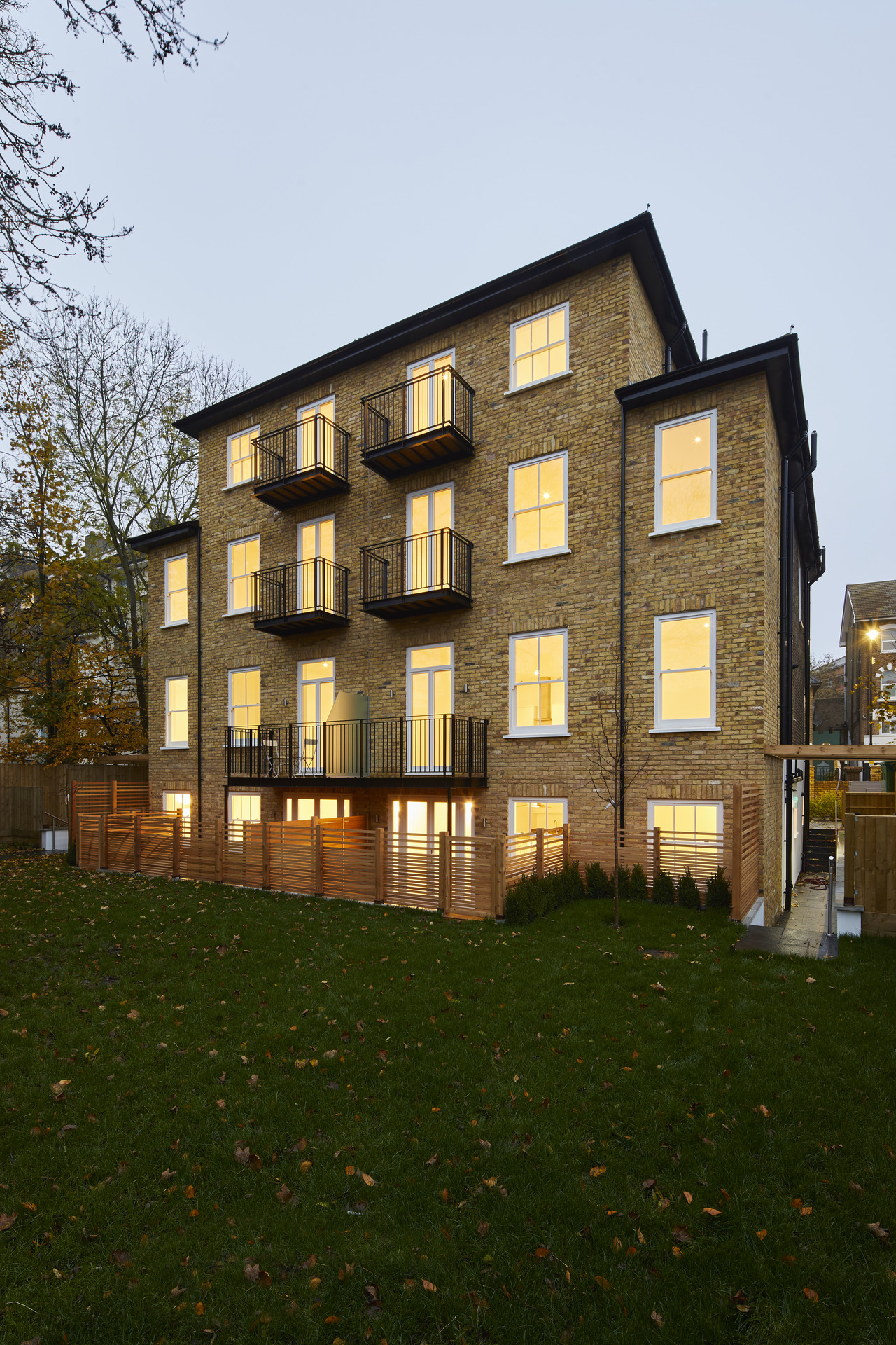 A full height full width rear extension was added, and the 2 houses re-configured into 12 flats, incorporating balconies to the rear elevation (image shown) and a shared communal garden.