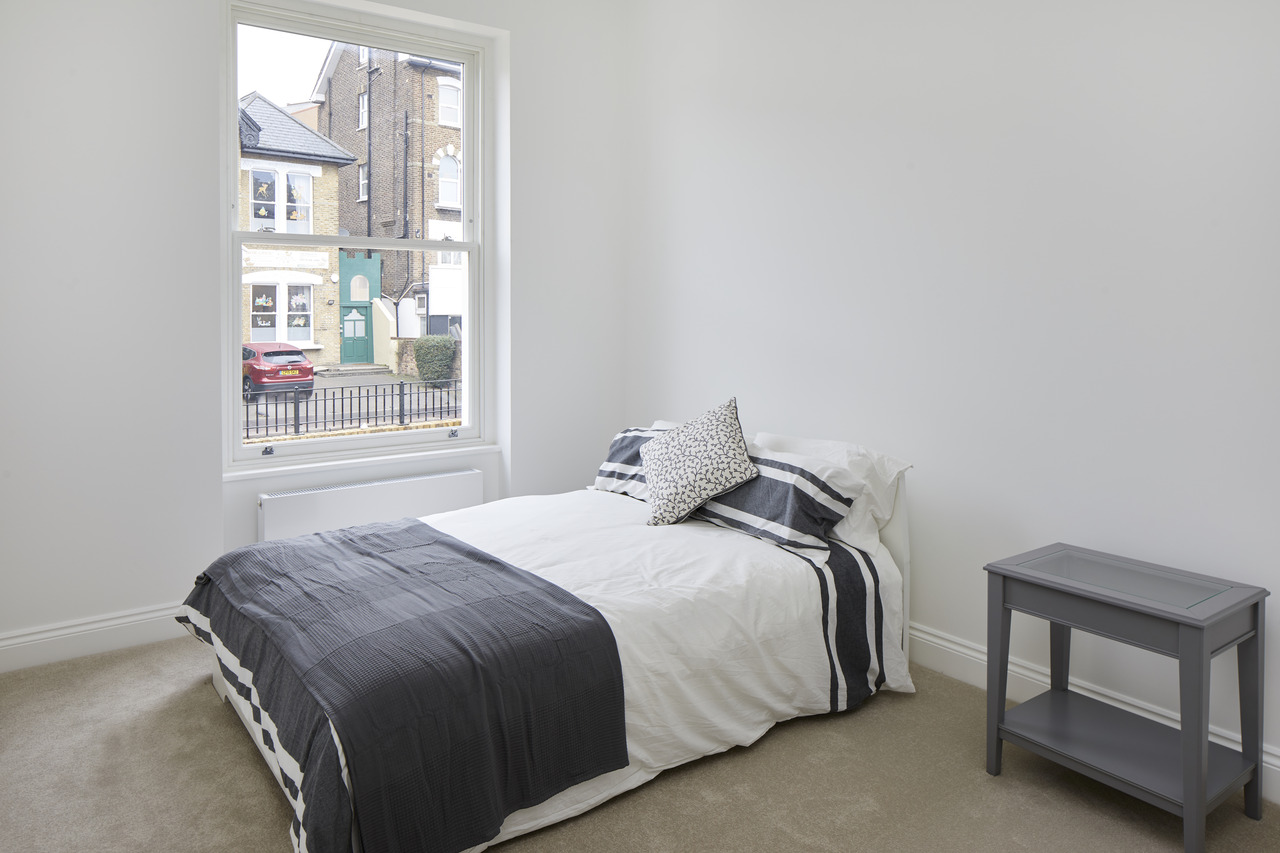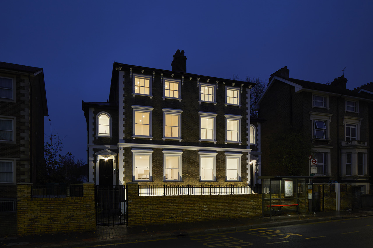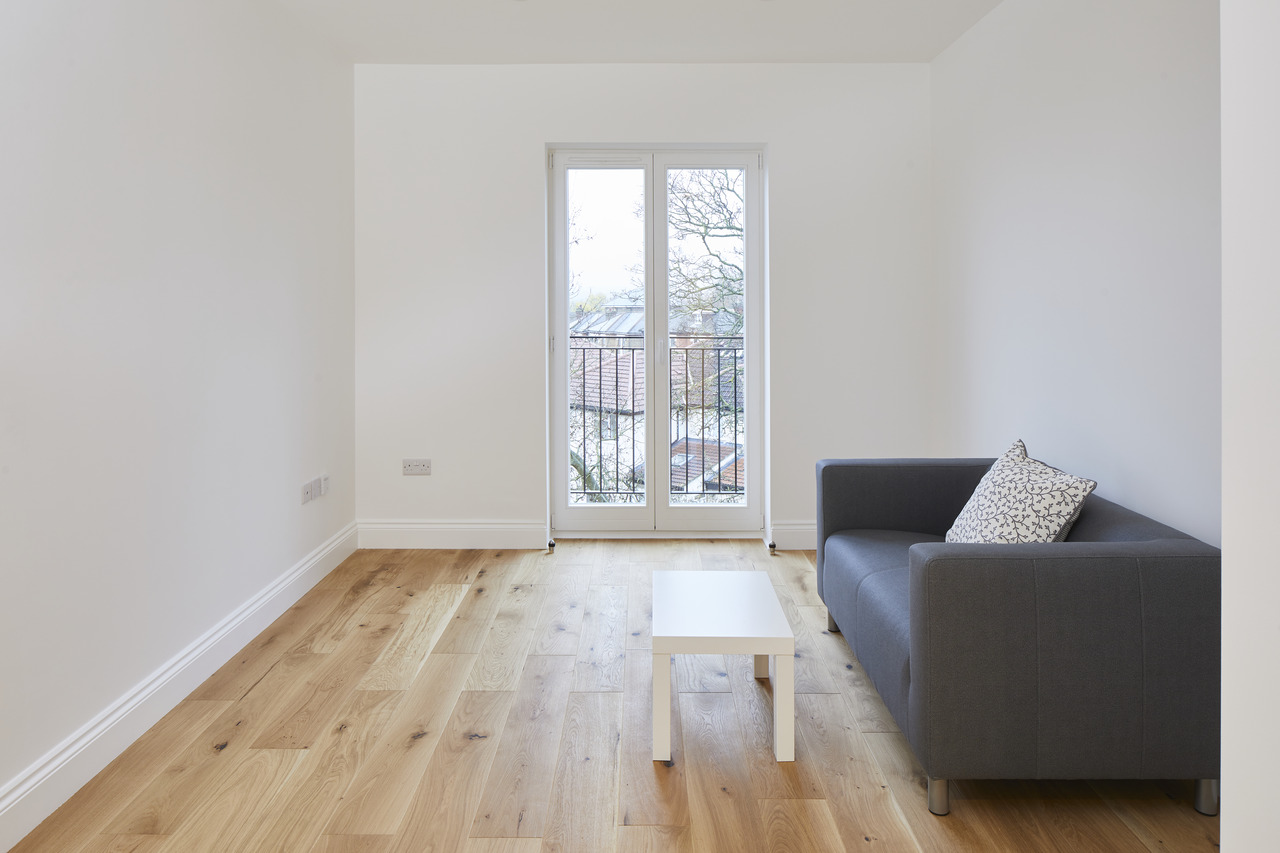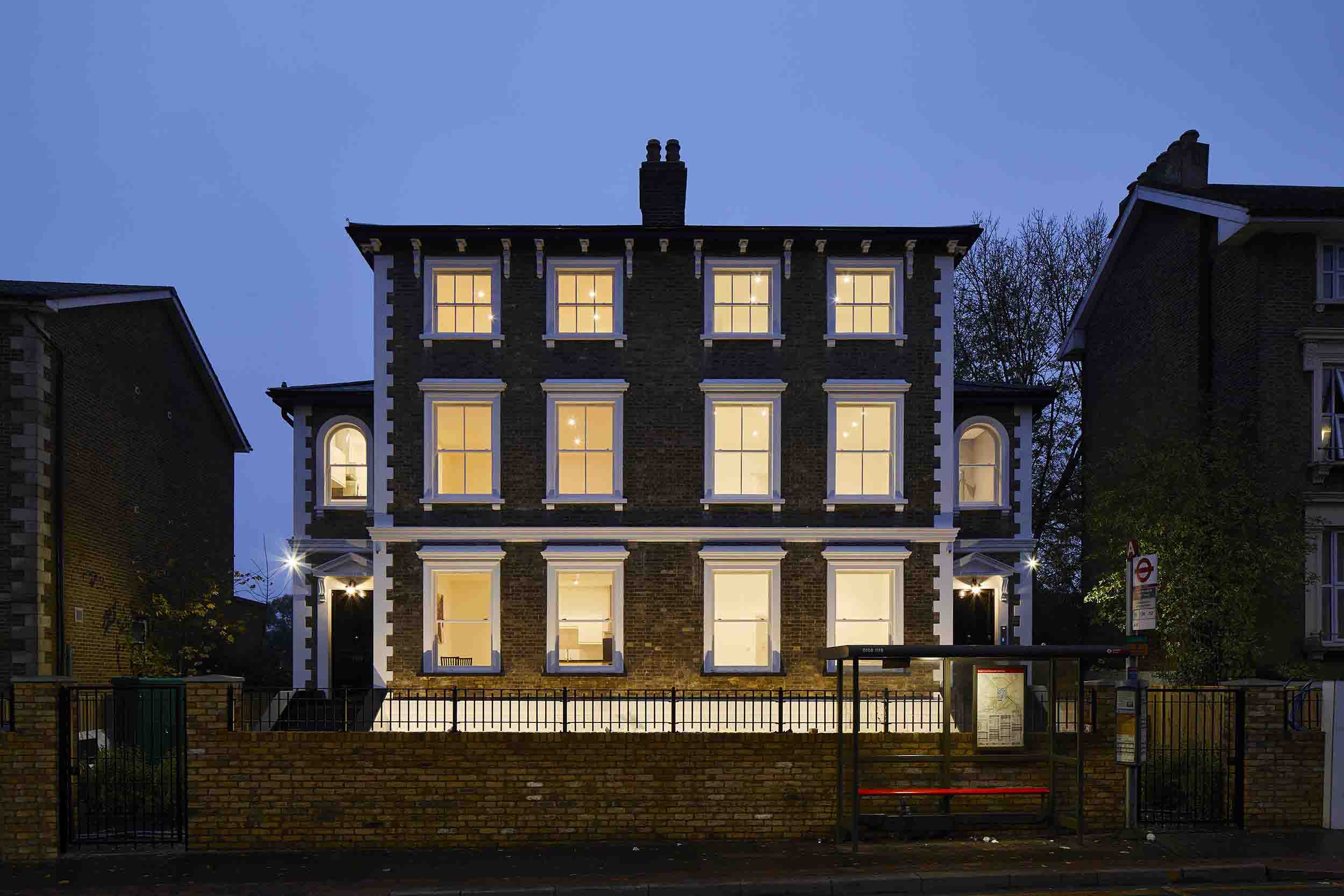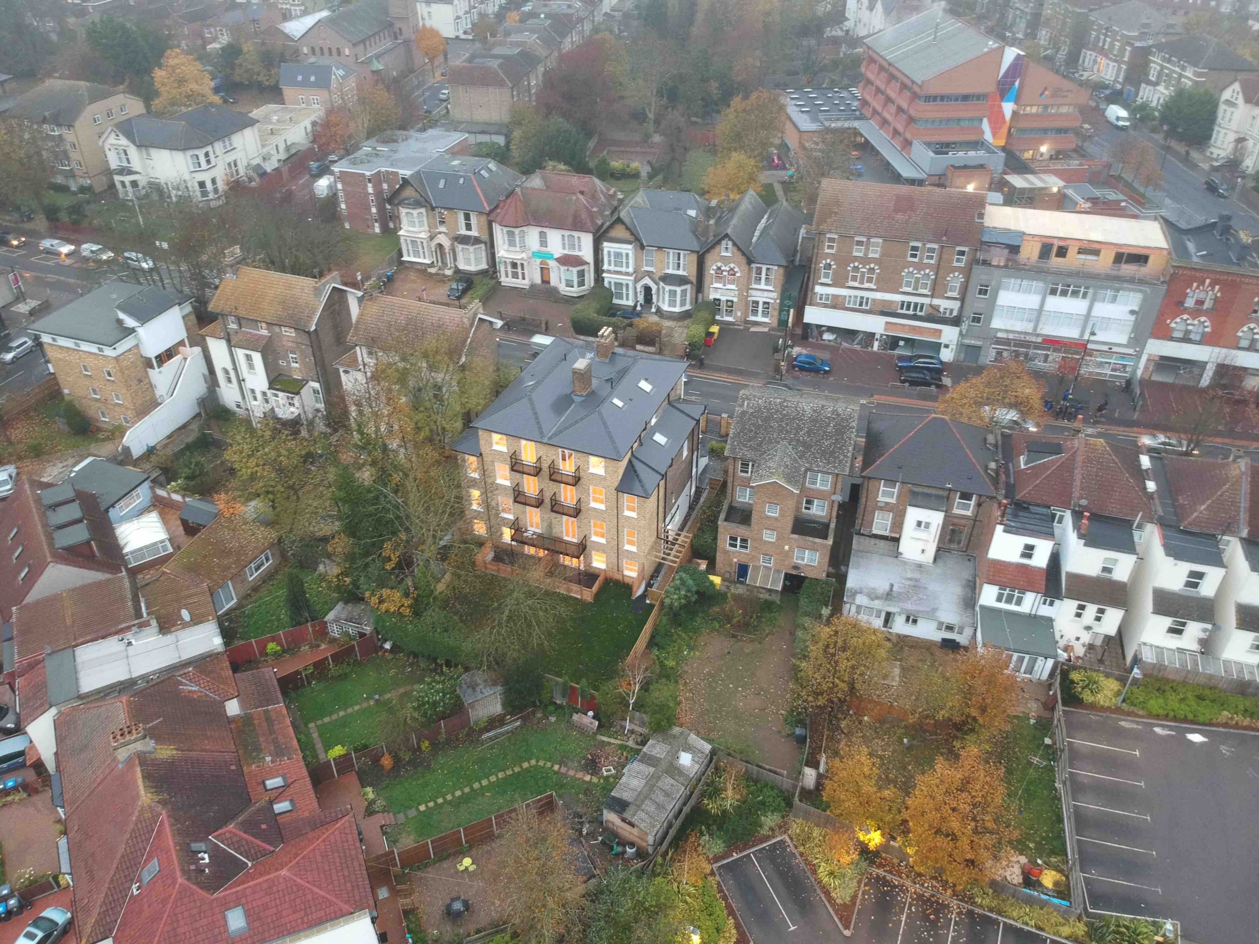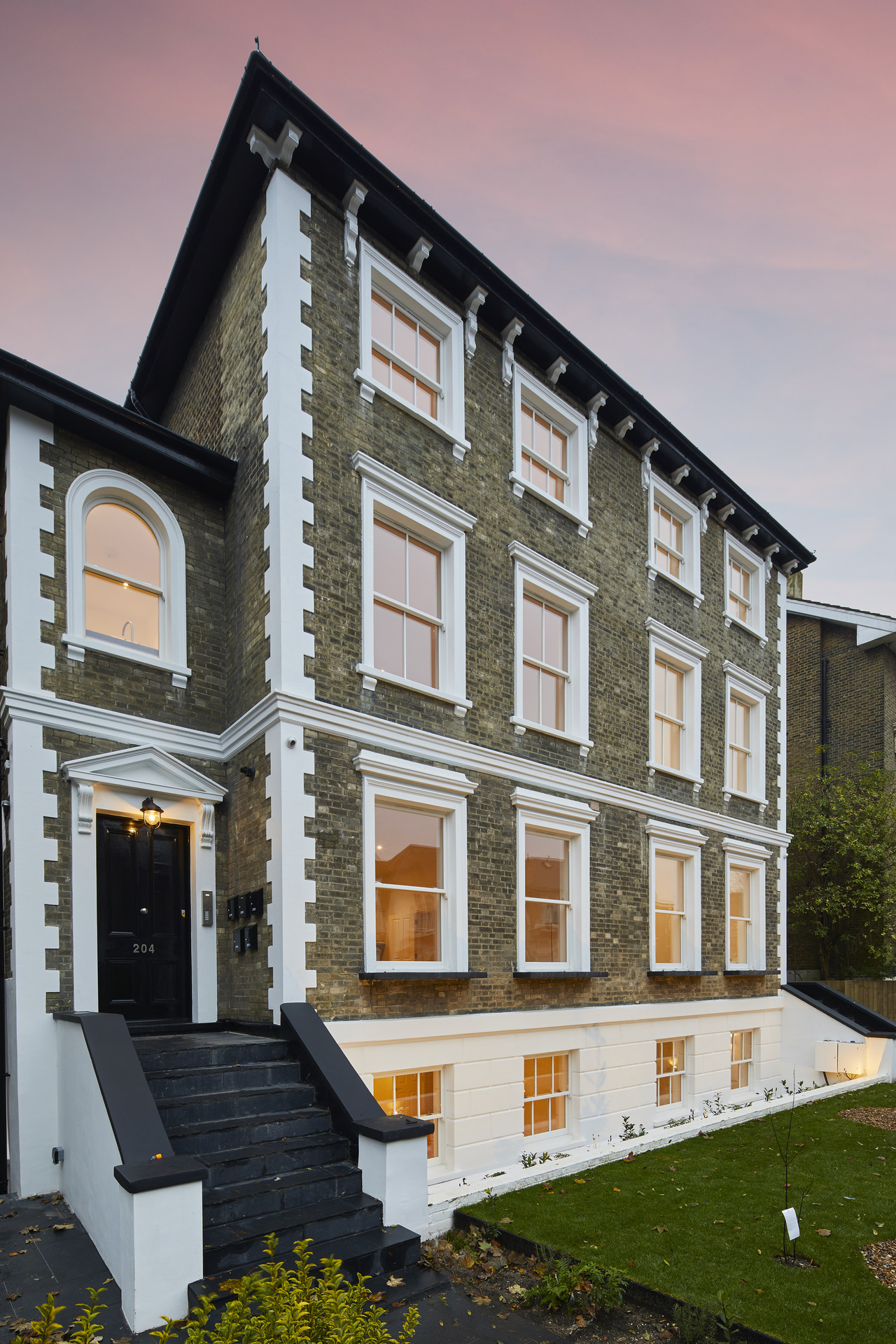A full height full width rear extension was added, and the 2 houses re-configured into 12 flats, incorporating balconies to the rear elevation (image shown) and a shared communal garden.