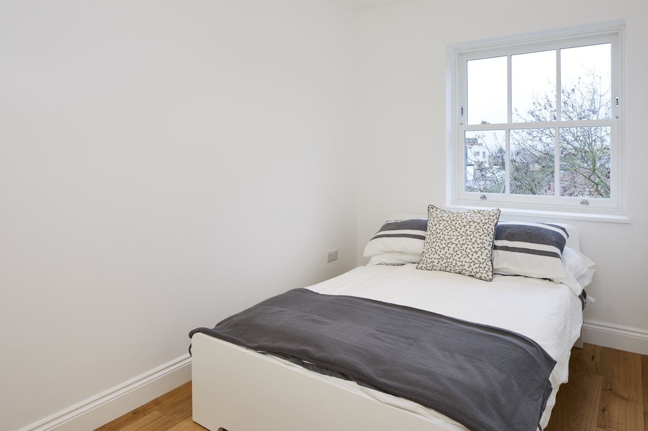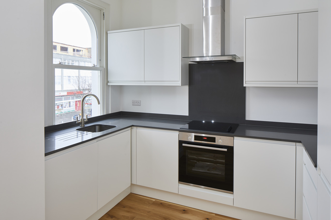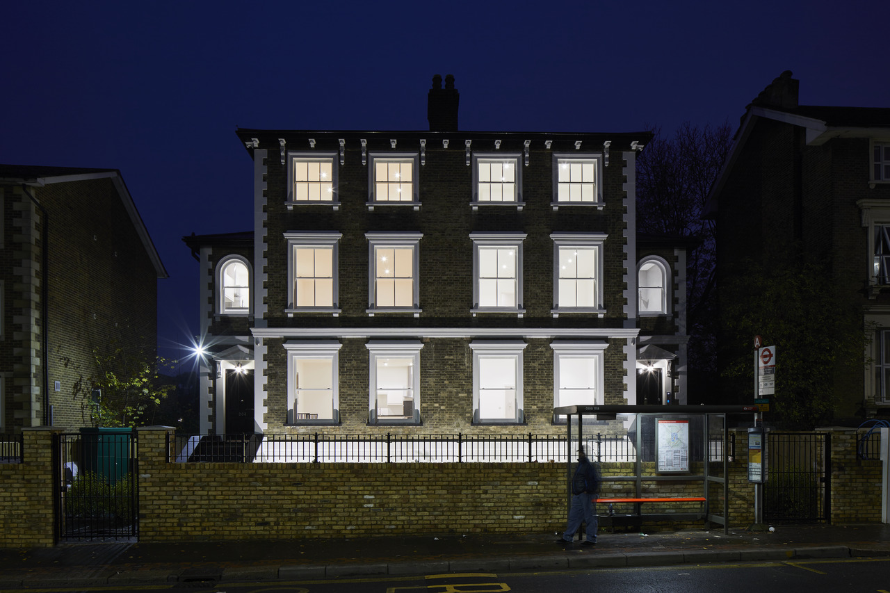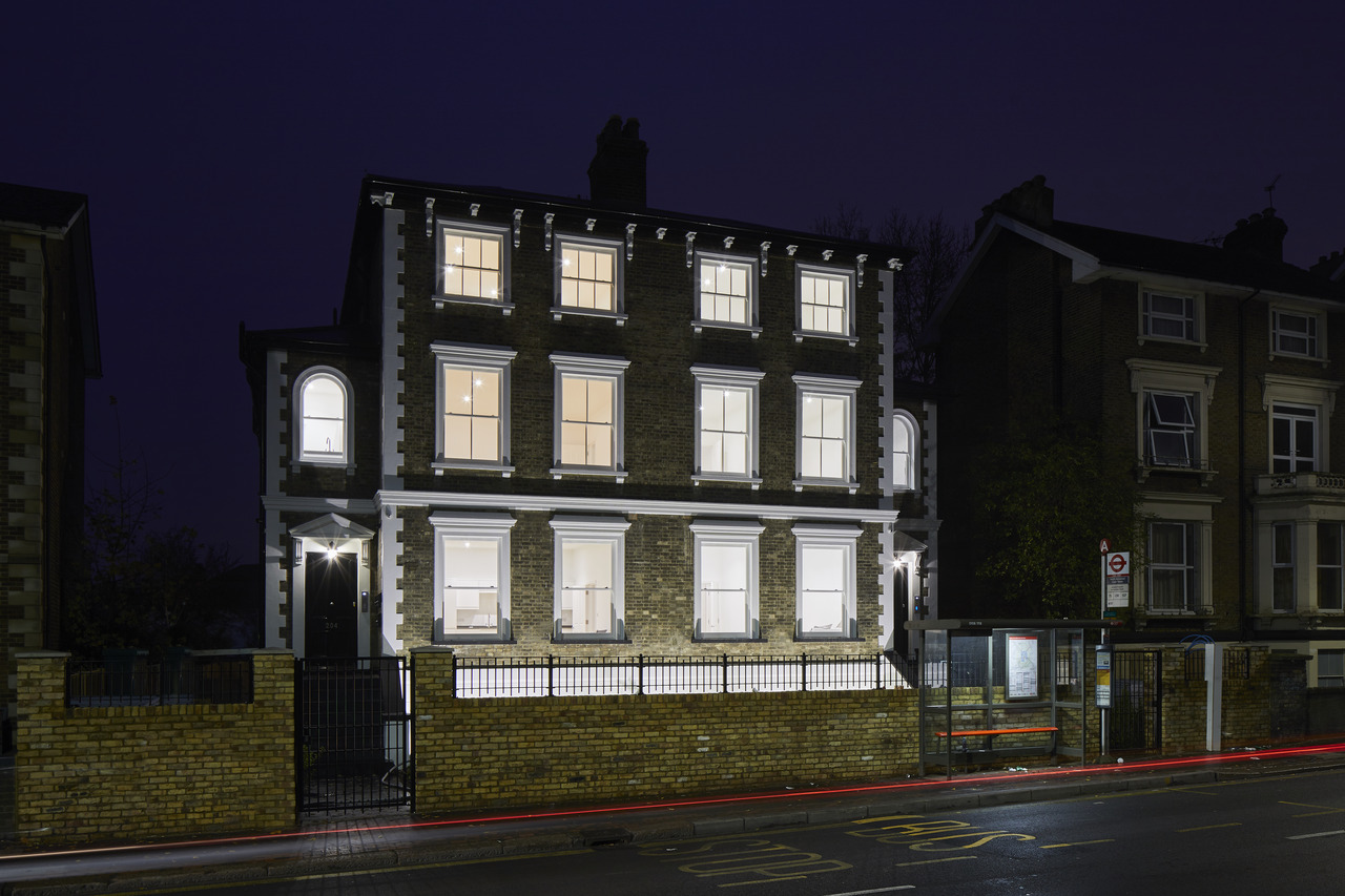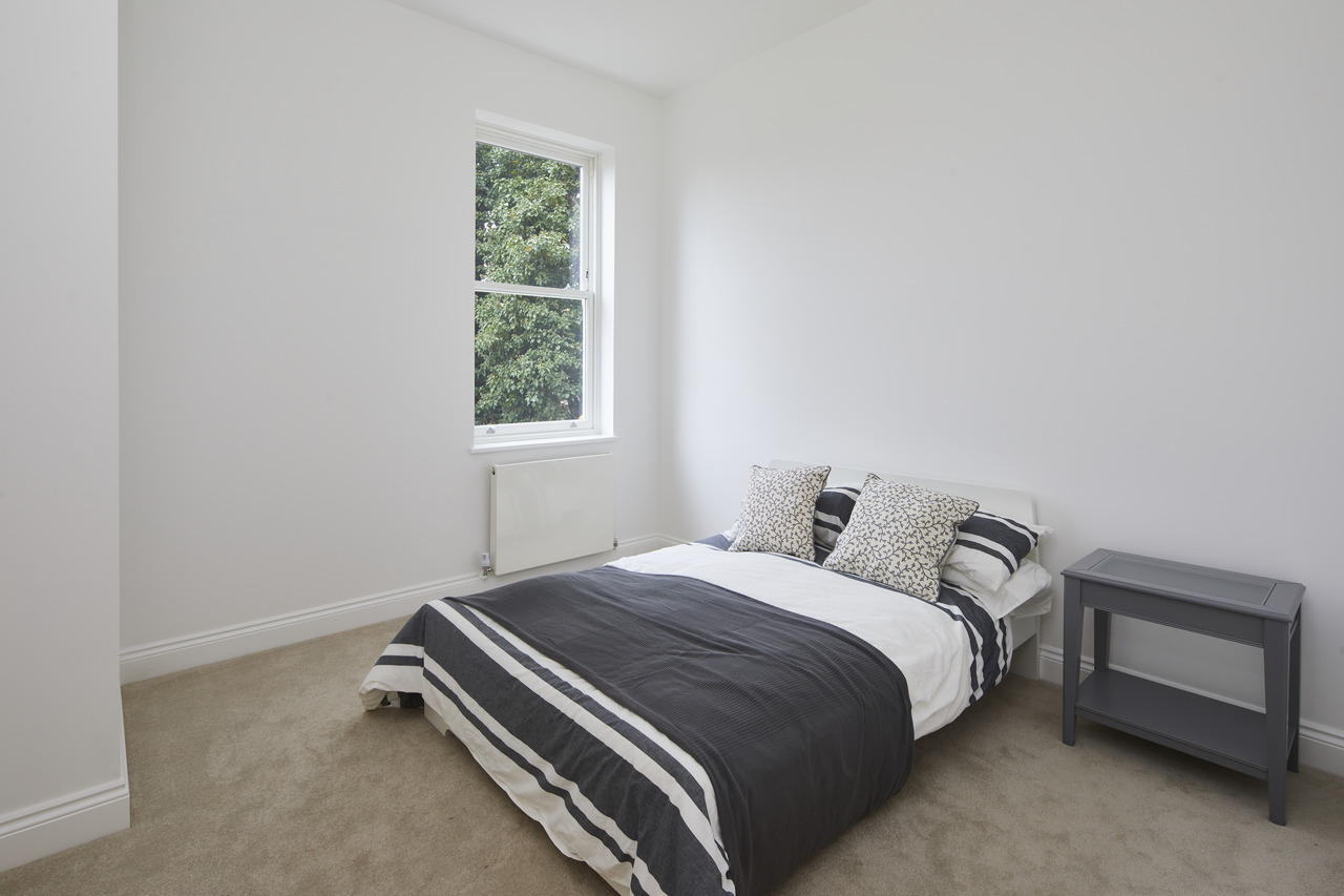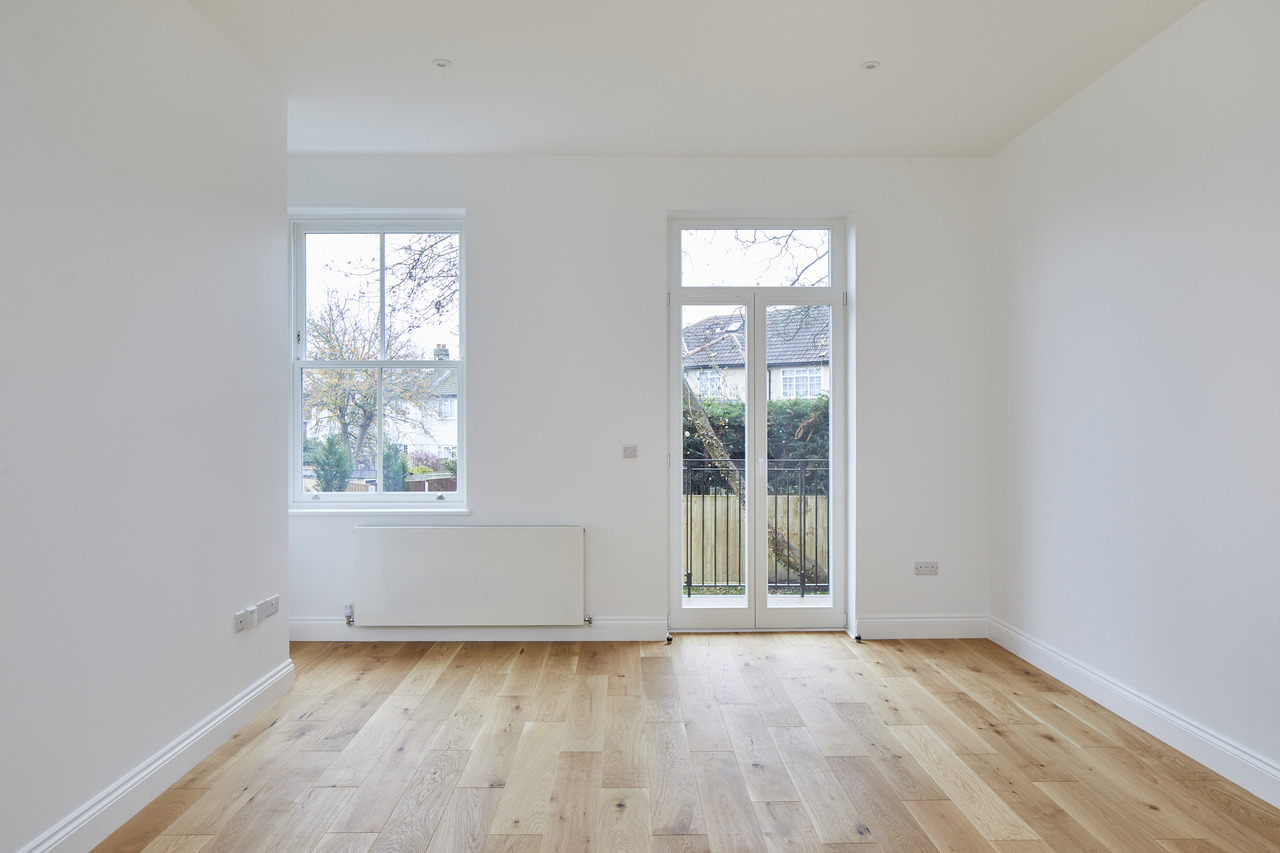 A full height full width rear extension was added, and the 2 houses re-configured into 12 flats, incorporating balconies to the rear elevation (image shown) and a shared communal garden.