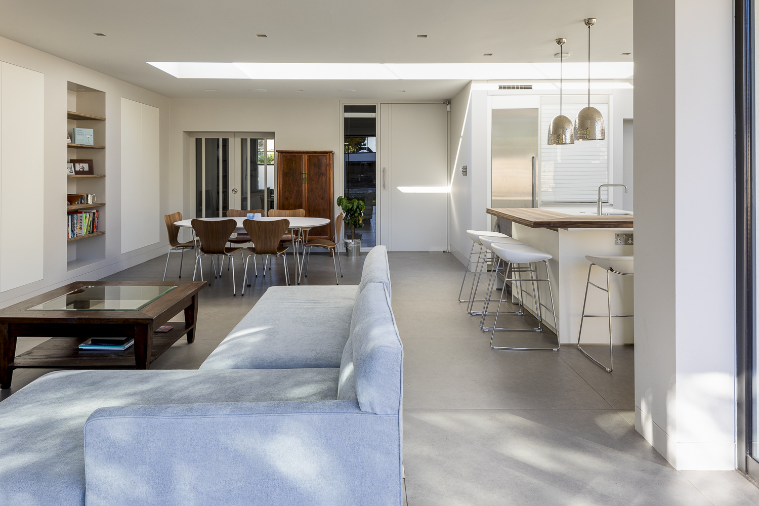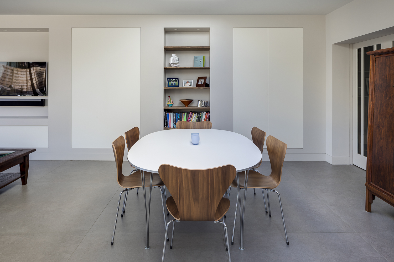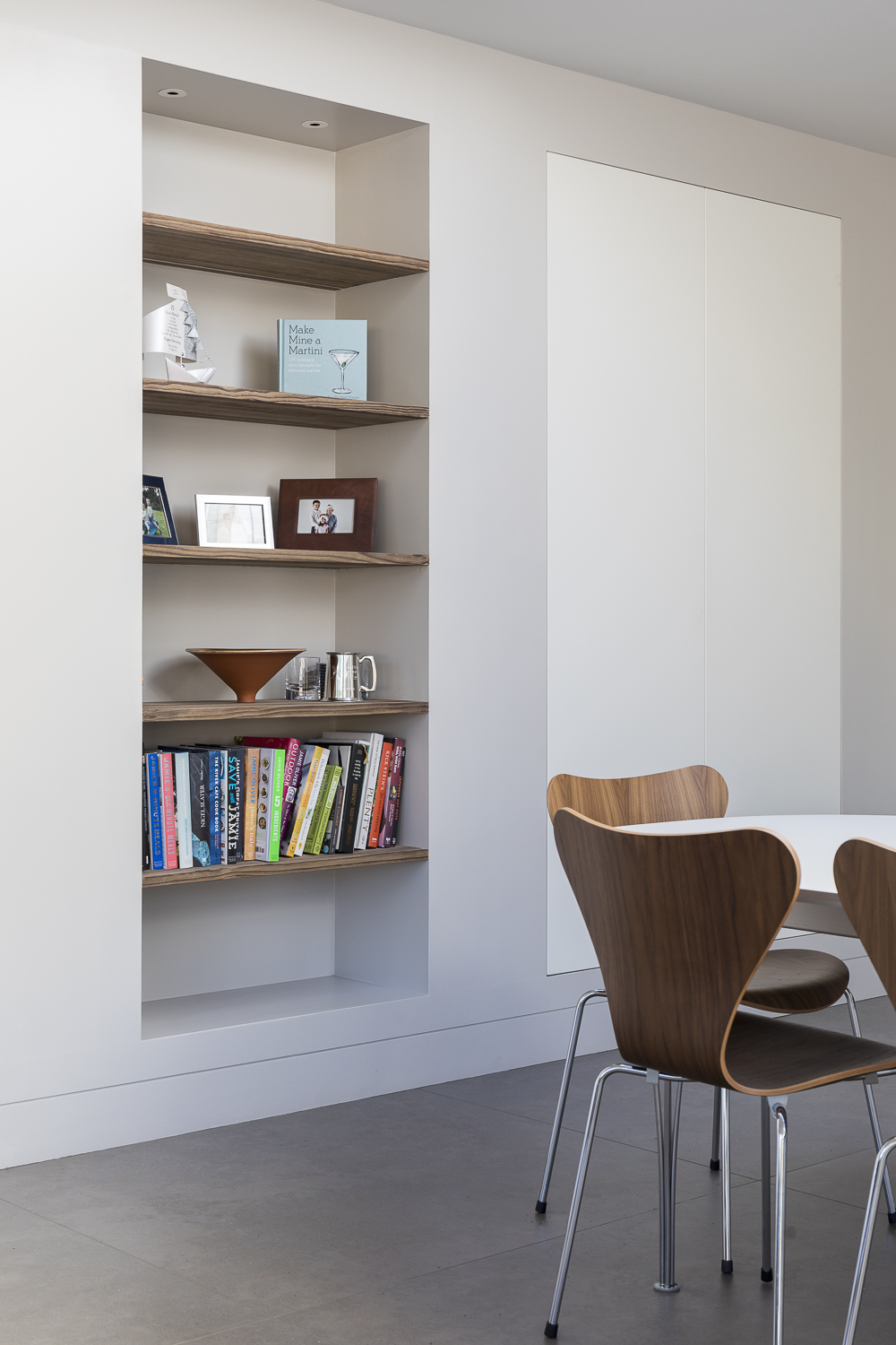 The brief required Modern living for the busy urban commuting family with teenagers, with uncluttered spaces, and careful integration of storage and technology.